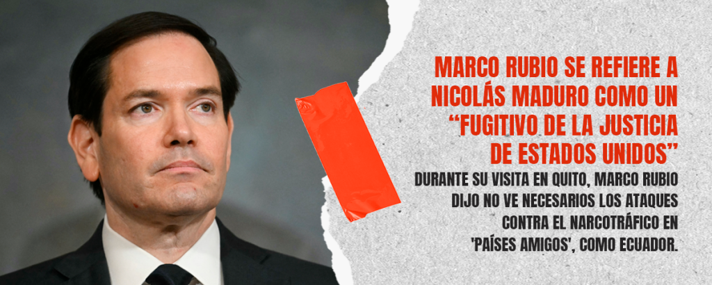 El jefe de la diplomacia estadounidense, Marco Rubio, elevó el tono contra el presidente venezolano Nicolás Maduro, a quien señaló como “fugitivo de la justicia estadounidense” por cargos de narcotráfico. El pronunciamiento se produjo durante su visita oficial a Ecuador, en medio de un contexto de creciente tensión militar en el Caribe.
