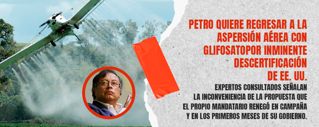 El presidente Gustavo Petro causó sorpresa al plantear el regreso de la aspersión aérea con glifosato para erradicar cultivos de uso ilícito, una política suspendida desde hace más de una década por orden de la Corte Constitucional.