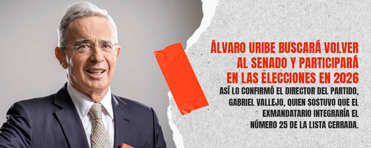 El expresidente Álvaro Uribe Vélez volverá oficialmente a la arena política como candidato al Senado en 2026. Así lo confirmó el director del Centro Democrático, Gabriel Vallejo, quien reveló que el exmandatario ocupará el número 25 en la lista cerrada de esa colectividad.