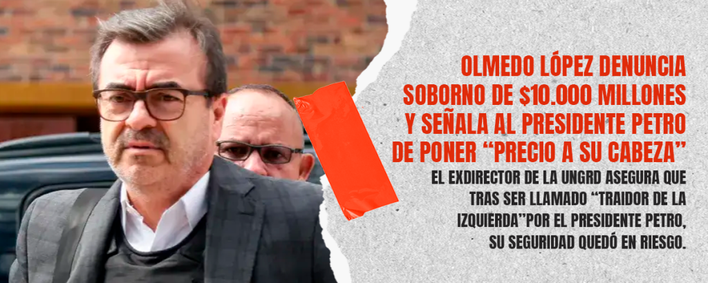 El exdirector de la Unidad Nacional para la Gestión del Riesgo de Desastres (UNGRD), Olmedo López, denunció que su vida y la de su familia están en peligro luego de que el presidente Gustavo Petro lo calificara públicamente como “traidor de la izquierda”.