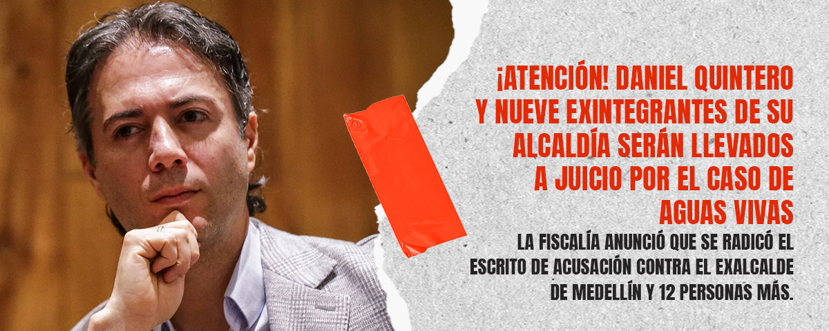 La Fiscalía General de la Nación anunció este martes la radicación del escrito de acusación contra el exalcalde de Medellín, Daniel Quintero Calle, nueve de sus exfuncionarios y tres particulares por presuntas irregularidades relacionadas con el predio Aguas Vivas.