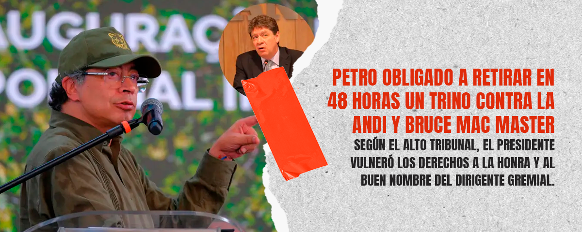 El Consejo de Estado le ordenó al presidente Gustavo Petro eliminar de sus redes sociales, en un plazo máximo de 48 horas, un mensaje que el tribunal consideró ofensivo contra Bruce Mac Master, presidente de la Asociación Nacional de Empresarios de Colombia (ANDI).