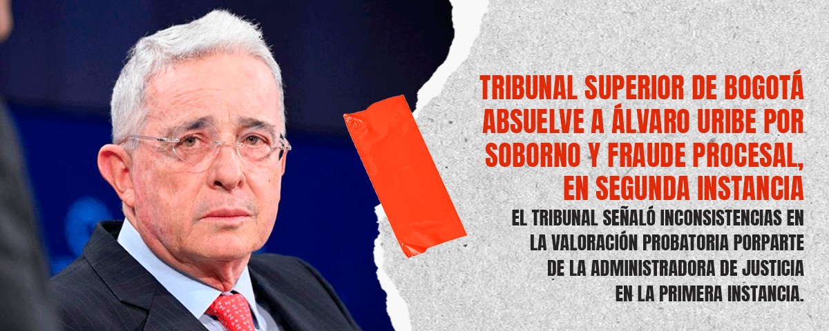 En una decisión de segunda instancia, el Tribunal Superior de Bogotá absolvió este martes al expresidente Álvaro Uribe Vélez de los delitos de soborno en actuación penal y fraude procesal, revocando así la condena dictada en primera instancia por la jueza 44 penal del circuito de Bogotá.