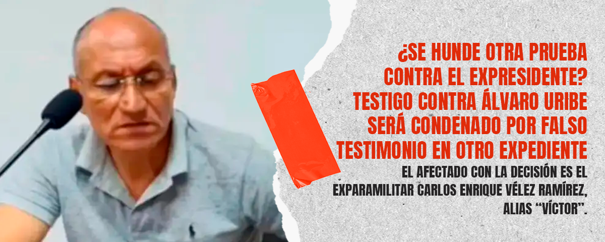 El exparamilitar Carlos Enrique Vélez Ramírez fue hallado culpable por mentir bajo juramento en otro proceso penal. Su testimonio había sido utilizado por la Fiscalía en la condena de primera instancia contra el expresidente Uribe.