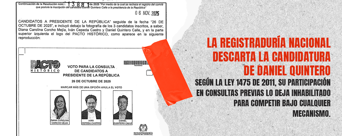 La Registraduría Nacional del Estado Civil le cerró formalmente la posibilidad al exalcalde de Medellín, Daniel Quintero Calle, de participar como candidato presidencial en las elecciones de 2026.