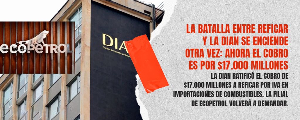La disputa entre la Refinería de Cartagena (Reficar) y la Dirección de Impuestos y Aduanas Nacionales (Dian) sumó un nuevo episodio esta semana, luego de que la autoridad tributaria notificara oficialmente a la filial de Ecopetrol el cobro de $17.406 millones por concepto de IVA en la importación de combustibles.