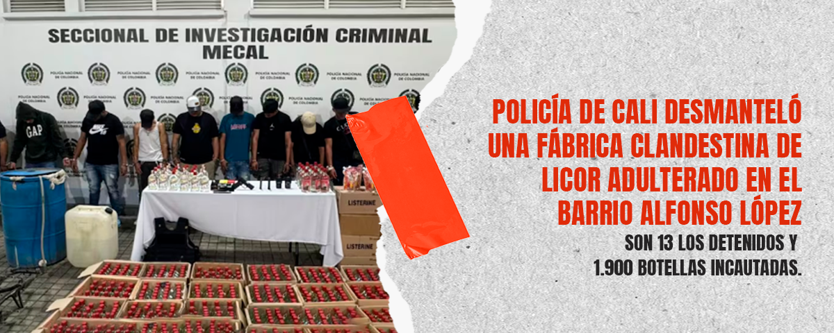 La Policía Metropolitana de Santiago de Cali desarticuló una fábrica clandestina que operaba en una vivienda del barrio Alfonso López, en la Comuna 7, donde se producían aproximadamente 1.000 botellas mensuales de licor adulterado destinadas a la venta ilegal en distintos sectores de la ciudad.