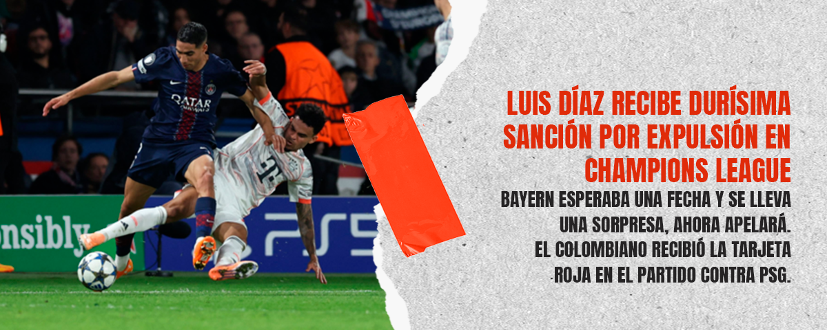La UEFA confirmó este viernes una sanción de tres partidos para el futbolista colombiano Luis Díaz, luego de su expulsión durante el duelo entre Bayern Múnich y Paris Saint-Germain en el Parque de los Príncipes, por la fase de grupos de la Liga de Campeones.