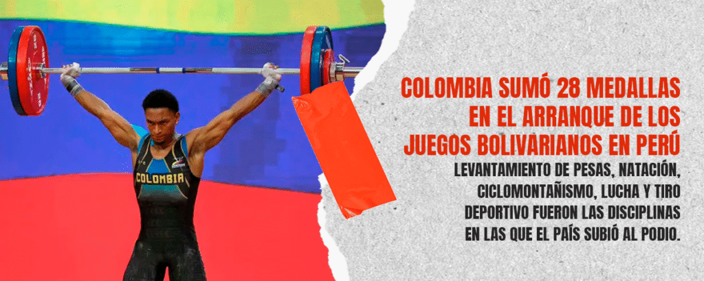 La delegación colombiana tuvo un desempeño sobresaliente en la jornada inaugural de los Juegos Bolivarianos que se desarrollan en Ayacucho, Ica, Callao y Lima. En total, el país obtuvo 28 medallas, distribuidas en 9 oros, 16 platas y 3 bronces, en disciplinas como levantamiento de pesas, natación, mountain bike, lucha y tiro deportivo.
