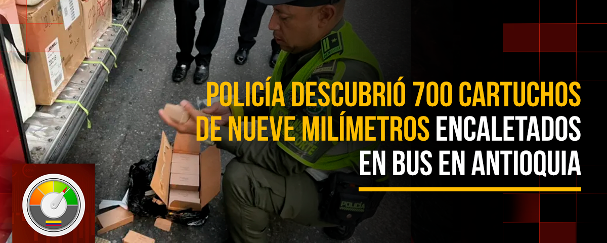 En un operativo de control en la autopista Medellín–Bogotá, la Policía Nacional incautó 715 cartuchos de calibre nueve milímetros que estaban ocultos en una encomienda transportada por un bus intermunicipal. La incautación se realizó el pasado 20 de noviembre a las 7:00 a. m. cerca del peaje de Copacabana.