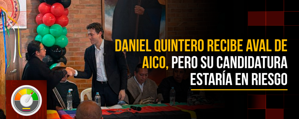 El exalcalde de Medellín, Daniel Quintero, anunció que el partido Autoridades Indígenas de Colombia (AICO) le otorgó su aval para aspirar a la Presidencia de la República en las elecciones de 2026, luego de quedar por fuera de la consulta del Pacto Histórico.