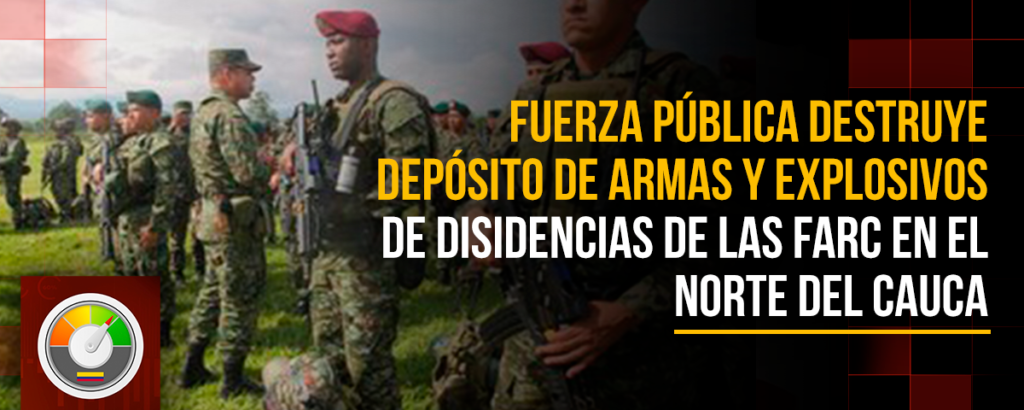 En desarrollo de operaciones militares en el norte del departamento del Cauca, la Fuerza Pública descubrió y destruyó un depósito ilegal de armas y explosivos perteneciente a la estructura Jaime Martínez de las disidencias de las Farc.