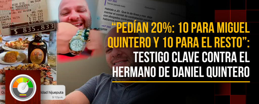 De acuerdo con información conocida en el expediente, una testigo habría asegurado que del 20% de comisión, 10% era para Miguel Quintero, hermano del entonces alcalde, y el porcentaje restante se distribuía entre otros integrantes del círculo que, según su versión, tendría influencia dentro de entidades como AMVA y Metroparques.