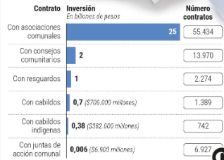 Los recursos fueron entregados a juntas de acción comunal, cabildos indígenas, resguardos y asociaciones comunales a través de esquemas de contratación directa, sin procesos de licitación pública.