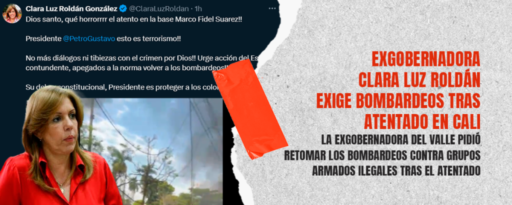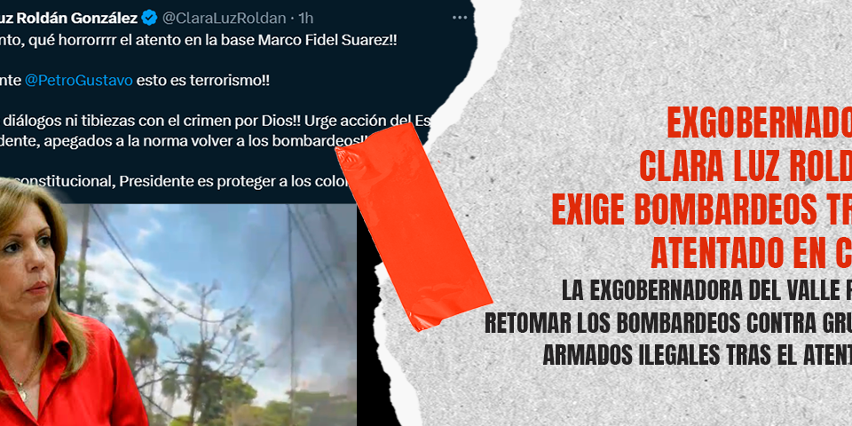 La exgobernadora del Valle, Clara Luz Roldán, pidió al presidente Gustavo Petro retomar los bombardeos contra grupos armados ilegales tras el atentado con explosivos en la […]